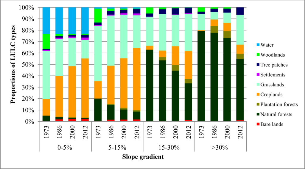 Distribution and changes of LULC were remarkably different along the slope gradient (Figure 4). Almost all of the LULC types were found in the four slope gradients of the study landscape with different proportions. Croplands, grasslands and water were dominant LULC types in the gentle slope part. On moderate slopes, croplands, grasslands, and the natural forests were found as the dominant covers. However, the natural forest and grasslands dominated the steep and very steep slope parts of the study landscape. Other LULC types were restricted to certain slope gradients. For instance, water, settlements, and bare lands were mainly found in the gentle and moderate slope gradients. Plantation forests were limited to moderate and very steep slope parts of the study landscape.