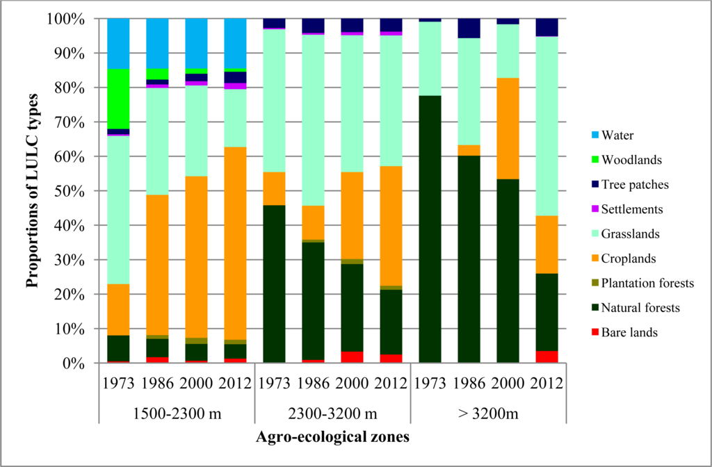 There was a distinct relationship between land use and agro ecological zones during the study period (Figure 5). In the sub-humid highland zone (locally known as “Weyna Dega”, 1,500–2,300 m), diverse LULC types were observed. All the classes of LULC types were found in this zone. Grasslands (43%), woodlands (17%), water (15%), and natural forests (8%) were the dominant LULC types at the beginning of the study period. In 2012, the dominant LULC types were croplands (56%), grasslands (17%), water (15%), and the natural forests (4%). Woodlands occupied only 1% in 2012. The numbers of LULC types were reduced in the humid highland zone (“Dega”, 2,500–3,200 m). In this zone, the dominant LULC types were grasslands (42%), natural forests (46%), and croplands (10%) at the beginning of the study period. However, in 2012, the dominant LULC types were croplands (35%), grasslands (38%), and natural forests (19%). In the cold highland zone (“Wurch”, >3,200 m), the natural forests (78%), grasslands (22%), and tree patches (1%) were major LULC types in 1973, and grasslands (52%), natural forests (23%), croplands (17%), and tree patches (5%) were the major LULC types in 2012.