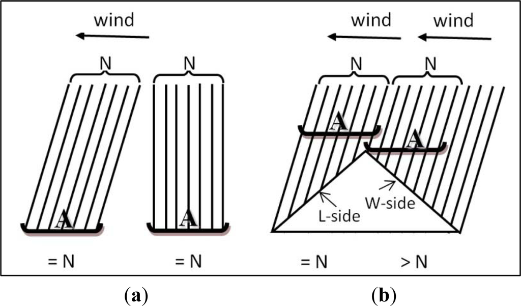 Wind affects rainfall intensities on various slope aspects. N demotes the number of raindrops. The parallel lines stand for rainfall vectors. A denotes the rain gauge area for collecting the rains. (a) In plain area, rainfall amount remains the same with or without horizontal wind; (b) In sloping area, rainfall amounts for leeward and windward side are affected by topographic conditions.