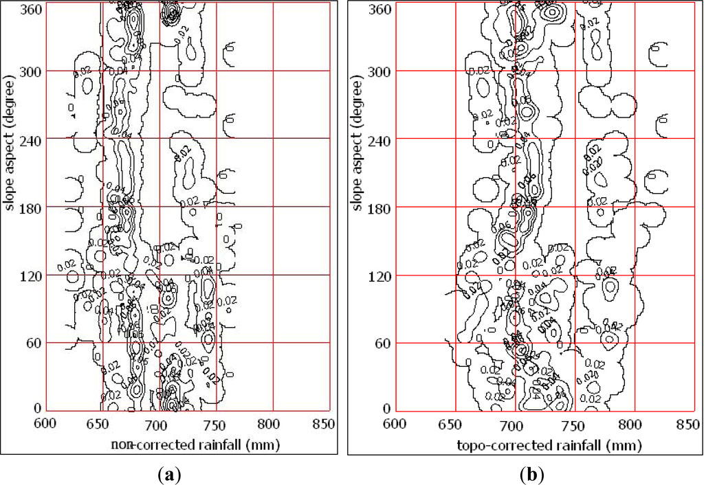 Comparing Figure 10(a) and 10(b), the general S-shaped banding of landslide density after correction is the most obvious difference. Because the prevailing windward slopes are in the aspects of 180–270 degrees of azimuth, the topographic-corrected rainfalls are raised in larger amount than those of other slope aspects. The general trend of the S-shaped banding is thus formed. If the rainfall is not corrected with topography and slope aspects, most landslides take place when rainfall is in the range of 650–680 mm with no specific influence of slope aspects. However, in the prevailing windward slopes in the aspect of 180–270 degrees, landslides take place in a very narrow band. Then the rainfall thresholds of windward slopes become more than 700 mm. In the leeward-side of 0–90 degrees of azimuth, a banded feature still exists, but it is a wider band. These features show that landslide processes in different aspects are not the same. The landslide period in windward slopes is relatively shorter, and rainfall thresholds for initiating processes are relatively higher. Both of these features are due to rainfall vectors in the opposite direction of the slope aspects.