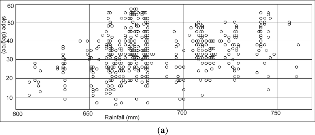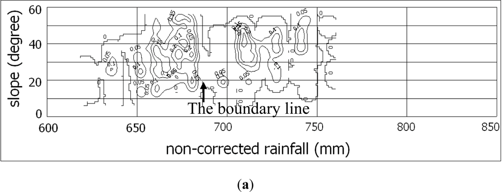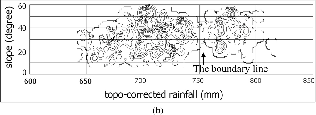 Figure 11 shows the pattern of landslide occurrence. The vertical axis is slope angle and the horizontal axis is rainfall. Figure 11(a,b) are plotted with the landslides only on SPOT images taken after Mindulle, where rainfall of Figure 11(a,b) are without and with topographic correction, respectively.