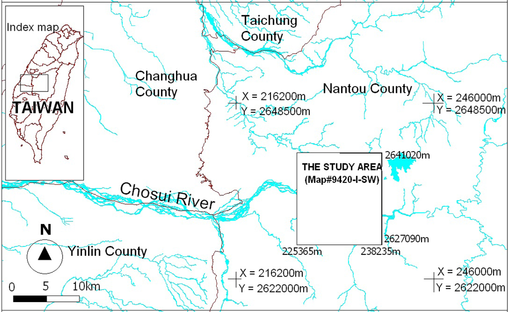 The study area is located in Nantou County, central Taiwan (Figure 2). This area is included in map number 95201SW in the national map series. The area covers 12,816 m in the east-west direction and 13,901 m in the north-south direction. The terrain has a very high relief. Rock formations are highly fractured due to the active mountain-building processes prevailing in Taiwan.
