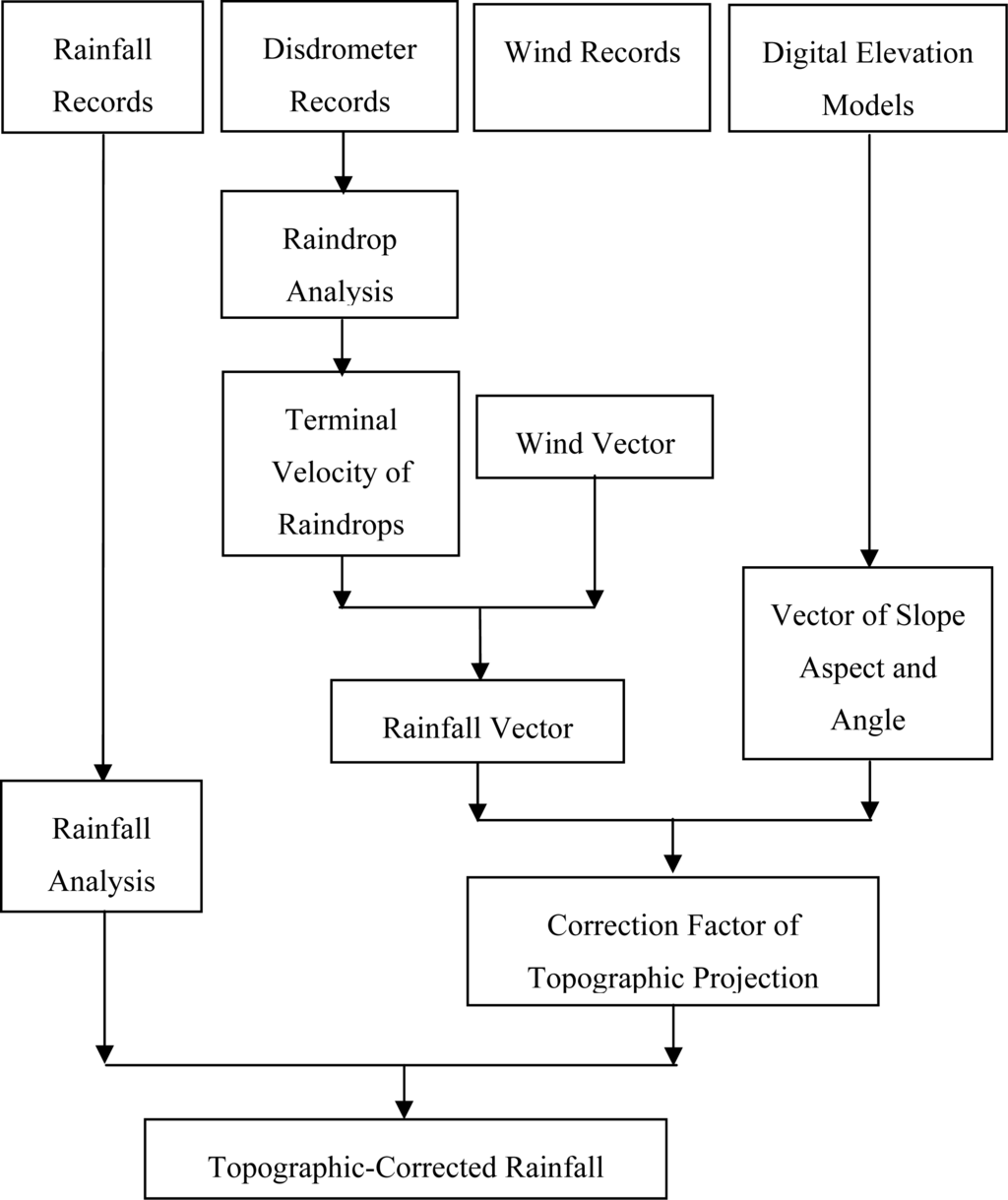 The rainfall vector is composed of wind speed and terminal velocity of raindrops, and projection of a rainfall vector onto a ground surface defines the amount of topographic correction needed. Wind speed vectors are deduced from wind records from weather stations. Terminal velocity of raindrops is derived from either raindrop distribution recorded by disdrometer or a specific rainfall pattern inference of the dedicated rainfall event. Subsequently, the projected rainfall vector of each grid cell is deduced employing a digital terrain model. Original rainfall distribution in the area is then adjusted with this correction.