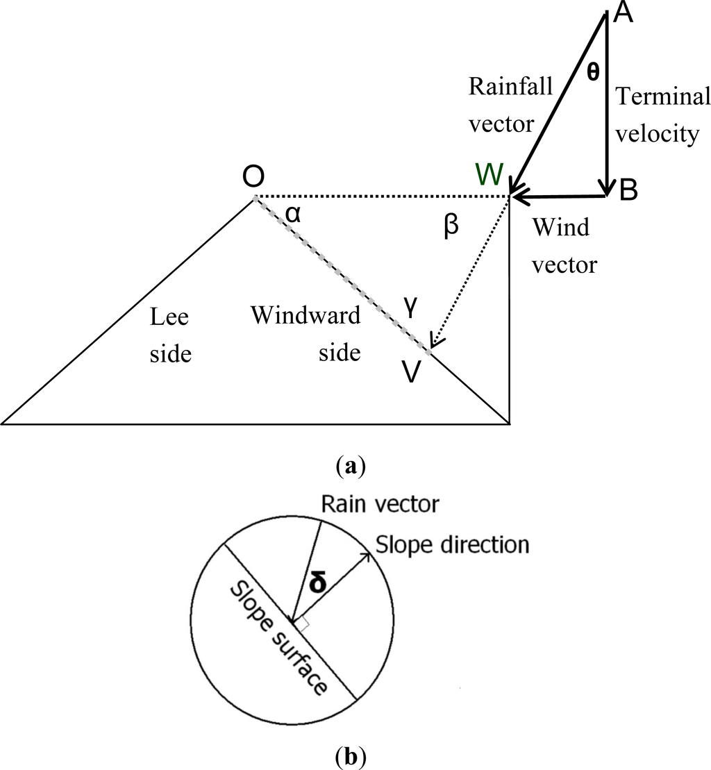 (a) Derivation of topographic correction factor (Kt), which is the ratio of OW to OV. (b) When the azimuth of rainfall vector deviates from slope direction where the rainfall component maximize, a correction has to be applied. Delta (δ) is the deviation angle of rainfall vector from slope direction.