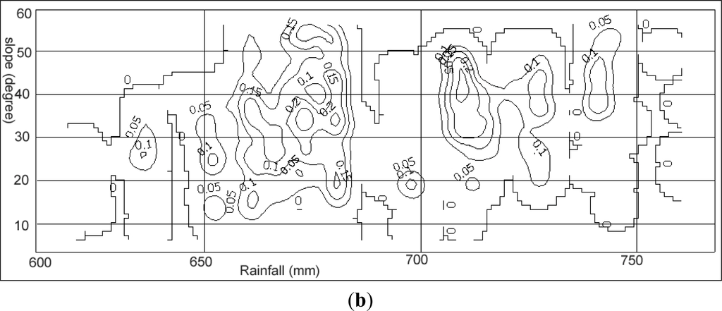 Landslide occurrence with respect to a certain factor can be presented with a statistical table describing the fractions of each attribute class. The ordinate axis is the frequency and the abscissa axis is the attribute classes. This could be presented with a scatter plot as well. As shown in Figure 5(a), each landslide that occurred after the typhoon event is plotted as a point with the slope on the vertical axis and rainfall on the horizontal axis. Clusters of points indicate concentration of landslide occurrences. The scatter plot could be further processed with kernel density estimation, as shown in Figure 5(b). Kernel density is a nonparametric way to estimate the probability density function for a given variable [34]. Unlike histograms, kernel densities do not group data into bins, but use small bumps estimated by the kernel function. Instead of a simple mathematical division of the area covered by landslides of the total study area, kernel density estimation produces a map of smoothed continuous intensity estimation. Compared with a histogram, the interactions of two parameters such as slope and rainfall could be visualized, which improves the perception of the controlling factors.