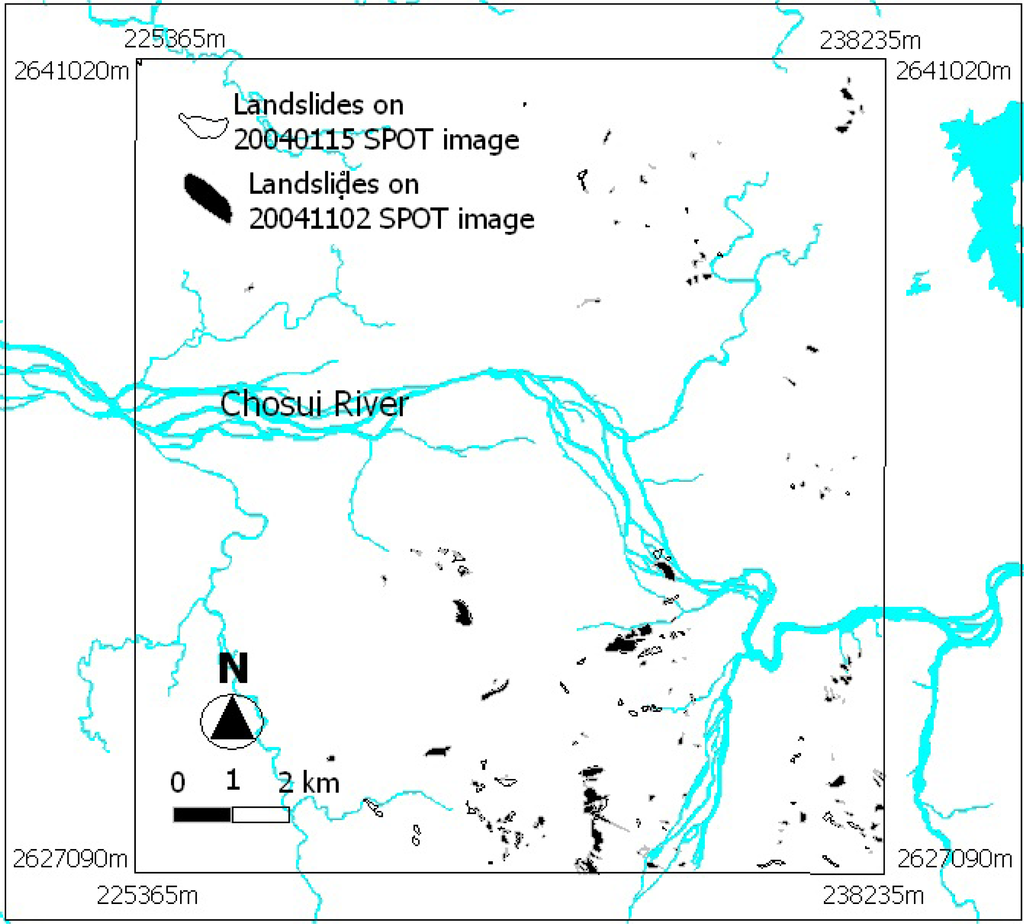 A landslide is a highly complex subject. Understanding the occurrence of landslides is important to study their relationship with influencing factors, such as bedrock type, slope steepness, and hydrology. To interpret landslides that have already occurred, remote sensing images have been widely used. In this study, automated extraction of landslides is carried out with Satellite pour l’Observation de la Terre (SPOT) images first. The resulting landslide area is in pixels. Grouping and aggregation are then performed with morphological erosion and dilation operators. Subsequently, the landslides are mapped as a number of polygons through vectorization. All polygons smaller than 100 m2 are filtered out to avoid spurious features. While there are only a few omission errors, the commission error of landslide classification based solely on spectral images can be as high as 80% [12]. In order to reduce commission error, the landslide polygon map is overlaid with an orthophoto. This manual photographic interpretation procedure ensures the accuracy of the landslide classification by removing commission errors such as roads, parking lots, and other land cover types having spectral signature similar to landslide. Two landslide maps interpreted from SPOT images were thus created. One map depicts the existing landslide areas shortly before Typhoon Mindulle and the other map represents landslides shortly after.
