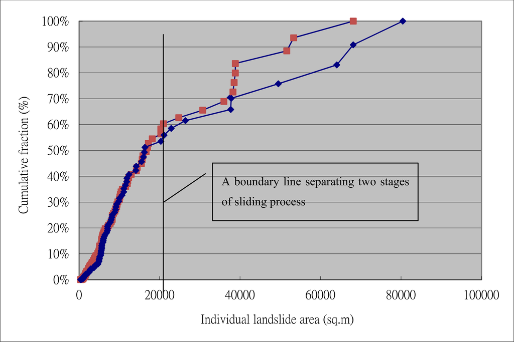 In general, the size distributions of landslides for before and after Mindulle show a similar trend. The area of individual landslides is proportional to the cumulative fraction. From the curves in Figure 7, there are two linear segments. This may represent two separate landslide processes. In the first, small landslides take place and comprise the first 10 to 60% of the cumulative percentage of total landslide area. This linear trend has a high slope in this first, indicating a rapid increase of small landslides when rainfall exceeds a certain threshold. The second starts from a cumulative percentage of more than 60% where a gentle slope of the linear trend is observed in the landslides after the event as shown by solid squares in Figure 7. This indicates that large-scale landslides with areas larger than 25,000 m2 are triggered after the occurrence of small landslides.