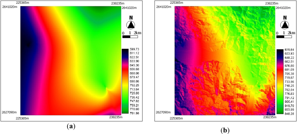Rainfall distribution interpolated from surrounding rain stations (a) without topographic correction, (b) with topographic correction. Rainfall unit is in mm. Location of the area is shown in Figure 2.