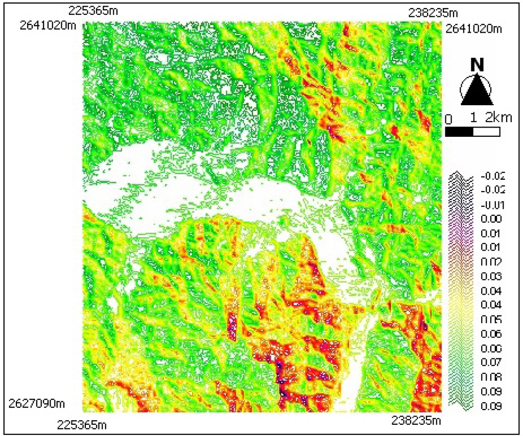 Rainfall distribution of the study area is derived from the rain records of the ten selected weather stations with the ordinary Kriging interpolation scheme. The maximum event rainfall in the study area is 782 mm and the minimum is 600 mm. Figure 8(a) shows the result of interpolation of the average rainfalls of the 12 hours prior to the peak intensity of the Mindulle event of the ten stations. In comparison, Figure 8(b) shows rainfall distribution with topographic correction. The landform undulation is marked on the rainfall map. Maximum rainfall after correction is 848 mm and the minimum becomes 620 mm. It is noteworthy that places with minimum and maximum values do not remain at the same sites before and after correction. As described in Section 3.4, the magnitude of correction factor depends on slope attitude; the location depends on whether it is a windward slope or leeward slope. This effect is further illustrated in Figure 9, which shows the percentage of difference between the adjusted rainfall map and the original rainfall map. In general, the effect of change is 11%. In the windward aspect, an increase of 8% rainfall is estimated, whereas a maximum deduction of 2% rainfall is estimated in the leeward aspect. There are very few areas where correction factors are negative. This shows that underestimation of rainfall intensity in the windward aspect due to topographic effect was obvious.