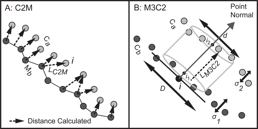 Conceptual diagrams of the C2M and M3C2 techniques. (A) The shortest distances between Ca and Mb are computed and stored as attributes of Ca. (B) The point normal for i is calculated using the scale, D. A cylinder with diameter d and a user-specified maximum length is used to select points in Cb and Ca for the calculation of i1 and i2, respectively. LM3C2 is the distance between i1 and i2 and is stored as an attribute of i. The local and apparent roughness of Cb and Ca are calculated as σ1 and σ2, respectively, which are used to calculate the SVCI for i. Both A and B are modified from Lague et al.[22].
