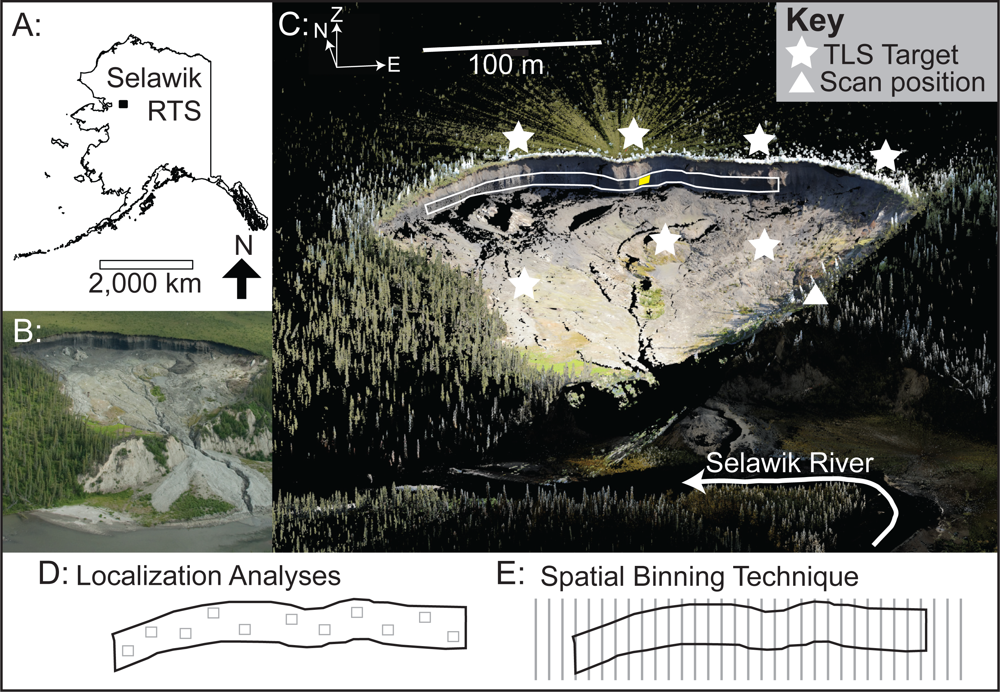 (A) Location map of the Selawik retrogressive thaw slump (RTS). (B) Oblique aerial photograph of the RTS. (C) Composite of several colored point clouds collected from multiple scan positions. The highlighted area is the data visible from the scan position used to collect the data set for this study. The area outlined by the long white polygon is the portion of the headwall further isolated for this study. The yellow polygon on the headwall is the area used in the empirical error analysis (Section 2.2.2). A post process GPS base station is located just outside the lower right corner of the image. The scale bar is accurate only in the direction of the x-axis (easting), because the point cloud in this image is projected orthographically. (D) Schematic of technique used in the localization studies presented in Section 3.4. (E) Schematic of technique used to generate the vertical spatial bins presented in Section 3.4.