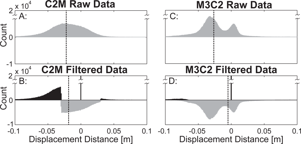 Histograms illustrating how displacements between 2012 scans no. 3 and 4 were processed using both C2M and M3C2. Dashed lines indicate the mean of each data set. (A) Raw C2M displacement data before filtering. Mean displacement is −0.023 m. (B) Filtered C2M displacement data. The hanging gray portion indicates displacements considered insignificant and converted to zero. The black portion indicates remaining displacements after filtering. Note that C2M uses a blanket detection threshold, which is reflected in the hard transitions between the black and gray portions of the histogram. Mean displacement is −0.019 m, and 61% of the raw displacements are considered insignificant. (C) Raw M3C2 displacement data before filtering. Mean displacement is −0.026 m. (D) Filtered M3C2 displacement data. The hanging gray portion indicates displacements converted to zero. Black portion indicates remaining displacements after filtering. Note that M3C2 utilizes a spatially variable confidence interval (SVCI), which is reflected in the overlapping portions of the black and gray distributions. Mean displacement is −0.005 m, and 95% of the raw displacements are considered insignificant displacements.