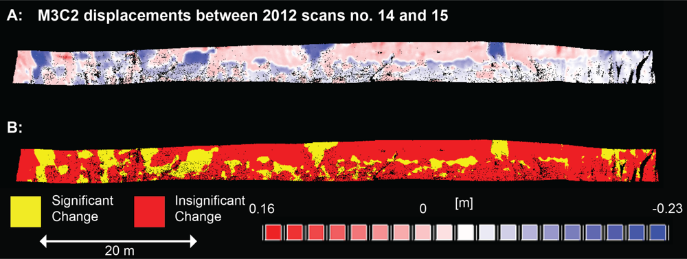 Two-to-seven centimeter topographic changes can be resolved under challenging survey conditions; however, daily resurveying of TLS georeferencing targets and two-sigma change detection thresholds were needed to reach this level of precision. We found M3C2 to be the most robust point cloud analysis method available, because it integrates a spatially variable confidence interval (SVCI) as a change detection threshold with displacement calculation. Furthermore, M3C2 can calculate true horizontal displacements, which allow the extraction of horizontal erosion rates from point cloud comparisons. Conversely, C2M uses a blanket change detection threshold and cannot calculate true horizontal displacements. A comparison of first and last measurement epochs using both methods illustrates that C2M reports a higher magnitude of topographic change over short periods of time (∼12 h) and reports a lower magnitude of topographic change over long periods of time (∼four weeks) when compared to M3C2. The SVCI used with M3C2 may classify too many displacements as insignificant, due to the uncertainty caused by surface roughness and scan registration; however, because we lacked true measurements of RTS headwall retreat, we were unable to evaluate this.