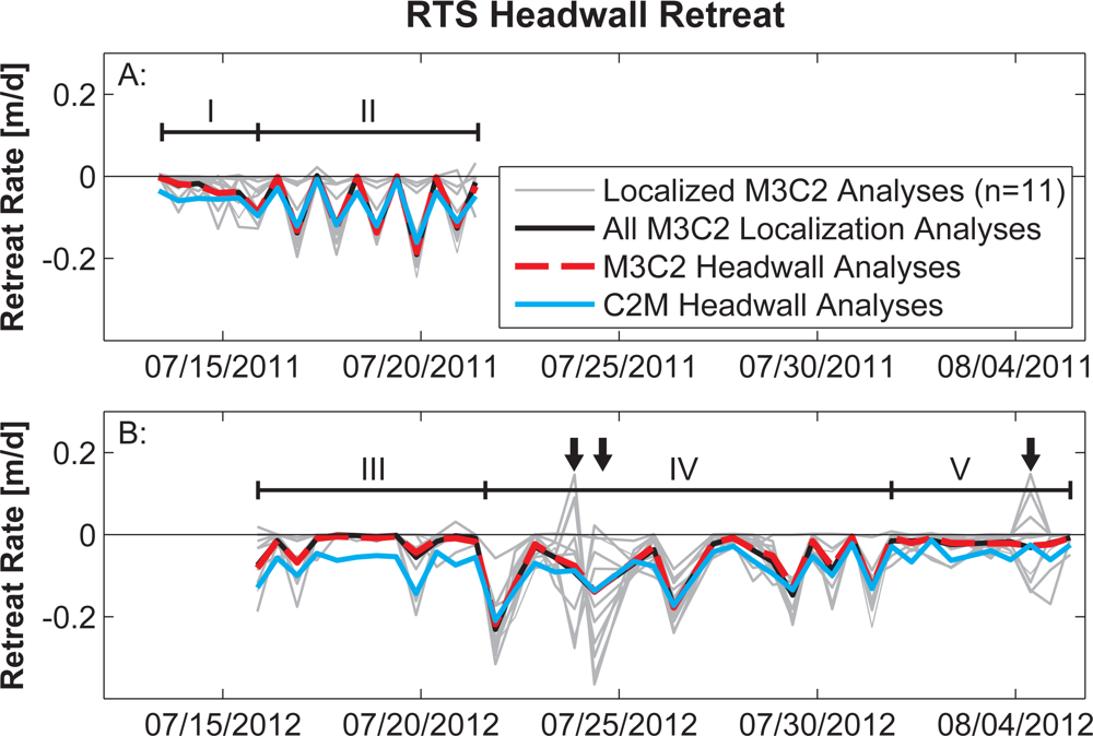 The RTS headwall retreat rate time series derived via M3C2 and C2M are similar in form; however, there are times when the data sets differ significantly. In this portion of the discussion, different portions of the time series in Figure 6 are indexed using line segments for clarity. For the 2011 data set (Figure 6(A)), the C2M and M3C2 analyses show significant differences during segment I and then follow the same pattern through segment II. For the 2012 data set (Figure 6(B)), the C2M and M3C2 analyses have the same general pattern as the 2011 data set, with the two techniques reporting rates of change with different magnitudes in segment III, similar rates of change in segment IV and distinctly different rates of change in segment V. In both 2011 and 2012, C2M consistently reports higher magnitude rates of change than the M3C2 algorithm during periods of comparatively low magnitude change (segments I, III and V) and sporadically reports lower magnitude rates of change during periods when the rate of change is highly variable (segments II and IV). Only rarely does the M3C2 algorithm report greater magnitude rates of change than the C2M technique. These patterns suggest that C2M consistently over-reports the magnitude of the rate of topographic change or that the M3C2 algorithm consistently under-reports the magnitude of the rate of topographic change. It remains unclear which technique best represents the actual topographic change occurring on the RTS headwall.