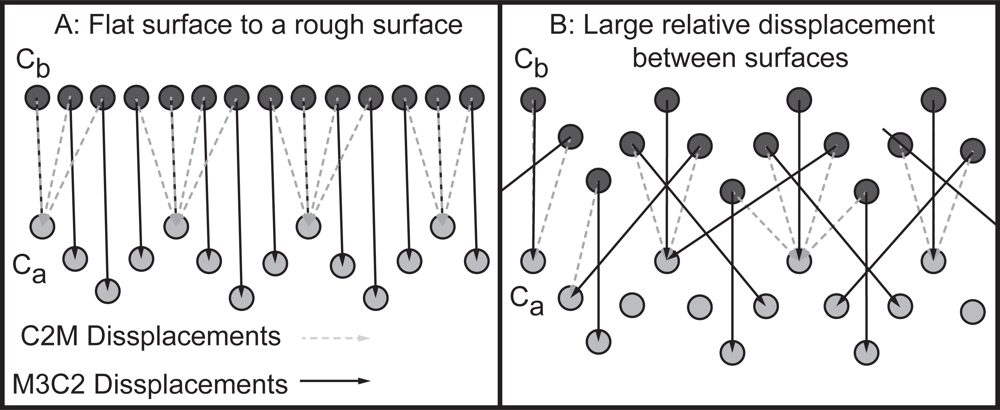 Conceptual diagram exploring scenarios when either M3C2 or C2M would be more appropriate topographic change detection tools. (A) A scenario where a surface changes from flat to undulatory, M3C2 may provide a better change detection analysis, because it is not biased by close points. (B) A scenario where the relative displacement between two measurement epochs is larger than the undulations in the surface and where D, the surface normal estimation scale, is smaller than the undulations. This causes some M3C2 displacements to reach across undulations. Under this scenario, C2M is still biased by close points, but it may provide a better analysis of topographic change than M3C2. Using M3C2 with D larger than the undulations in Cb would cause it to calculate displacements as if Cb were flat, which could correct this problem.