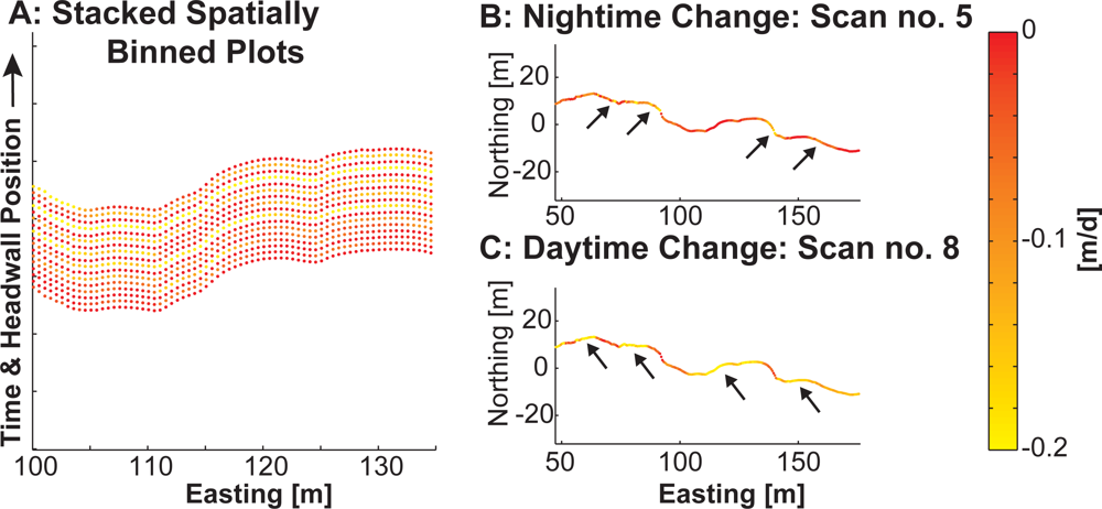 (A) Stacked plots from a section of the 2011 headwall that show both spatial and temporal changes in the RTS headwall retreat rate. Each epoch is artificially offset for clarity. The same diel pattern is visible here as in Figure 6(A). (B) Example of a spatially binned 2011 point cloud that captures nighttime change. Arrows indicate the general aspects with elevated retreat rates. (C) Example of a spatially binned 2011 point cloud that captures daytime change. Arrows indicate the general aspects with elevated retreat rates. The spatial and temporal information preserved in these plots suggests that shifts in the timing and location of the greatest retreat rates on the headwall are due to insolation.