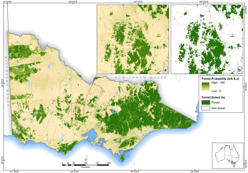 The conditional relationships between forest vegetation and biophysical factors can also be used to further improve forest/non-forest discrimination. Species-environment relationships are central to predictive geographical modelling [35]. Topographic variables (e.g., elevation, slope and aspect) used in combination with spectral data have been demonstrated to enhance forest, habitat and vegetation classification [19–22]. Bioclimatic maps (e.g., temperature, precipitation) are an additional source of commonly used ancillary classification data. These maps are typically developed using elevation-sensitive interpolation of climate station data and digital elevation models [35], which support the assumption that climate has a major influence on species distribution at broad geographic scales [36] and that similar compositions of vegetation can be expected to occur at sites with comparable soil, climate and topography [37]. In this paper, we evaluate the operational performance and utility of RF for classifying forest extent across Victoria, Australia, using remote sensing, topographic and climate predictor variables. The originality of this study lies firstly in the scale of the application of the RF algorithm, to construct, evaluate and implement an RF classifier to produce an accurate ∼220,000 km2 land management agency forest map. As far as we know, this scale of RF operation is unique. The second novel aspect to this study is in its application setting, which, to our knowledge, is the first time RF has been used in an operational environment at a regional scale comprising highly diverse and complex Australian forest ecosystems and topography, dominated by open canopy sclerophyll forests and woodland.