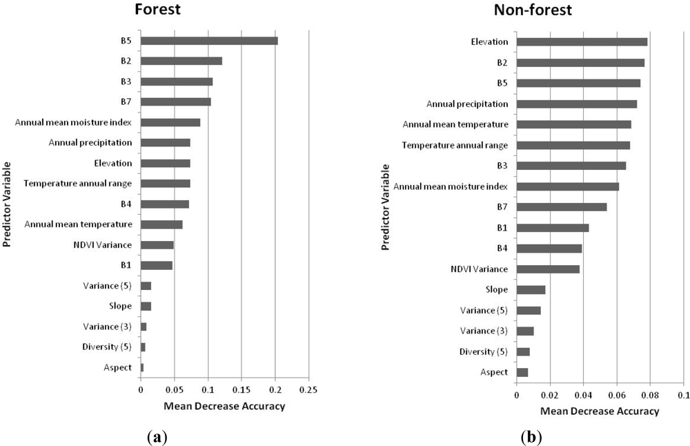 Landsat TM band 5 (shortwave infrared) was shown to be the most important variable in predicting forest (Figure 4(a)) based on the calculated mean decrease in accuracy (MDA) score. Band 5 was considerably more important than the next most important predictor variables—Landsat TM bands 2, 3 and 7, followed by elevation and the four climate surfaces. The high importance of the middle-infrared band 5 (1.55–1.75 μm) in differentiating forest from non-forest at the pixel-level is likely to be associated with its vegetation and soil moisture sensitivity properties. For non-forest classification, based on MDA, elevation was the most important variable in the RF model, followed by bands 2 and 5. The influence of elevation may be associated with less rainfall at lower elevations, but is also very likely to reflect the land use history of the study area, whereby low flat land productive agricultural land has been extensively cleared [64]. Landsat bands 5, 2, 3 and 7 were the most important predictor variables for forest/non-forest differentiation (Figure 4(c)).