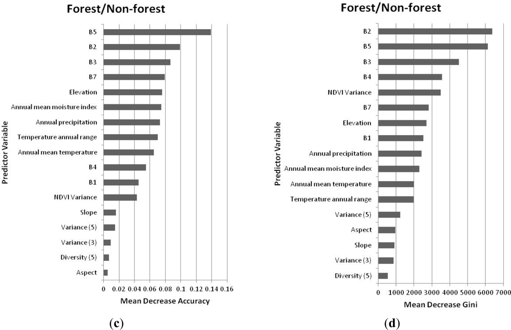 Random Forests predictor variable importance measures. (a) Mean decrease accuracy for forest prediction; (b) mean decrease accuracy for non-forest prediction; (c) mean decrease accuracy for forest and non-forest prediction; and (d) mean decrease Gini for forest and non-forest prediction.