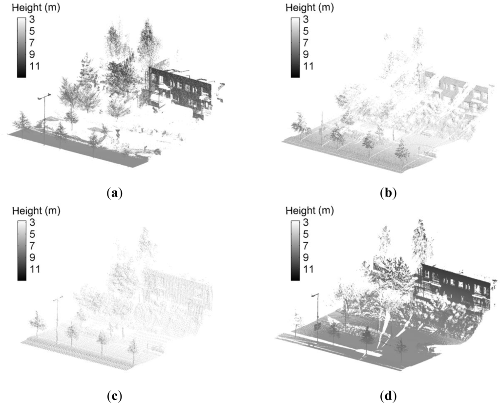 Illustrations of the morphologies derived from the point clouds collected by (a) Riegl VMX-250, (b) Roamer, (c) Sensei, and (d) Roamer in its stop-and-go mapping mode.
