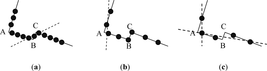 Obviously, low sampling densities are more likely to give incomplete plane representations. This conclusion can be evidenced by Figure 4(c), in which the building corners B and C are missed. With the increased point densities, the vertexes B and C are then captured in Figure 4(b) by intersecting two adjacent lines. Nonetheless, higher sampling densities still cannot ensure generating the absolutely-correct geometric models, as illustrated by corner A in Figure 4(b) and the fitted line BC in Figure 4(a). This example suggests that it is important to take the scale of the target into account when selecting an appropriate MLS system. When targets are diverse and simultaneously cover a variety of scales, higher sampling densities are a major advantage and a good choice to better target representation in a general sense.