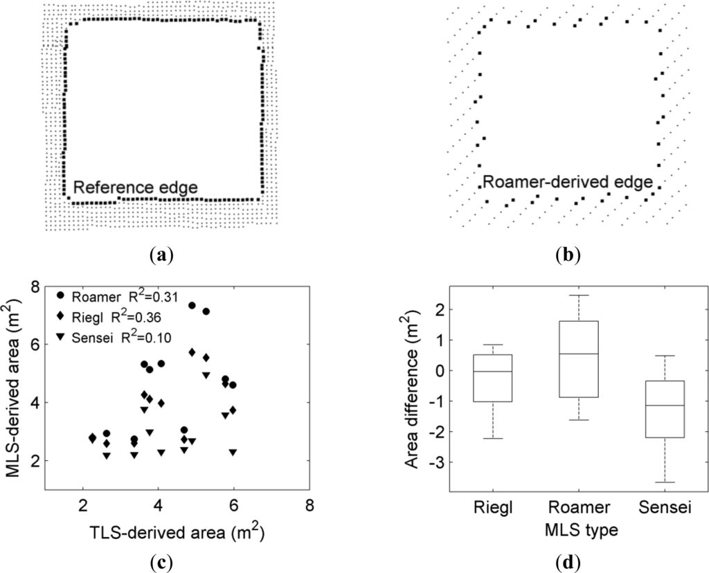 Illustrations of window edges derived from (a) the reference and (b) Roamer data. (c) Scatterplot of the derived window areas, and (d) boxplots of the area differences between the MLS-derived windows and the reference ones.