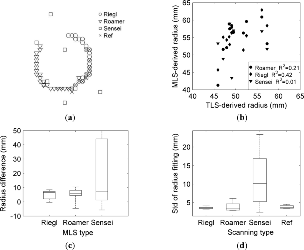 The R2 values show that the data collected by the Riegl VMX-250 has the best correlation with the reference data, and Sensei has the poorest. The boxplots of the radius differences between the MLS-derived pole cross-sections and the reference ones are shown in Figure 6(c). The pole representations derived from the Riegl VMX-250 data collections best represent the real ones, while the Sensei does the worst. Moreover, the standard deviations of the distances between the laser points and the fitted cylinder surfaces were also explored using boxplots (Figure 6(d)). Here, the reference data collected by Roamer in its stop-and-go mode was also regarded. The results show that the Riegl VMX-250 performs with the lowest dispersion, even better than the statistical results from the reference data.