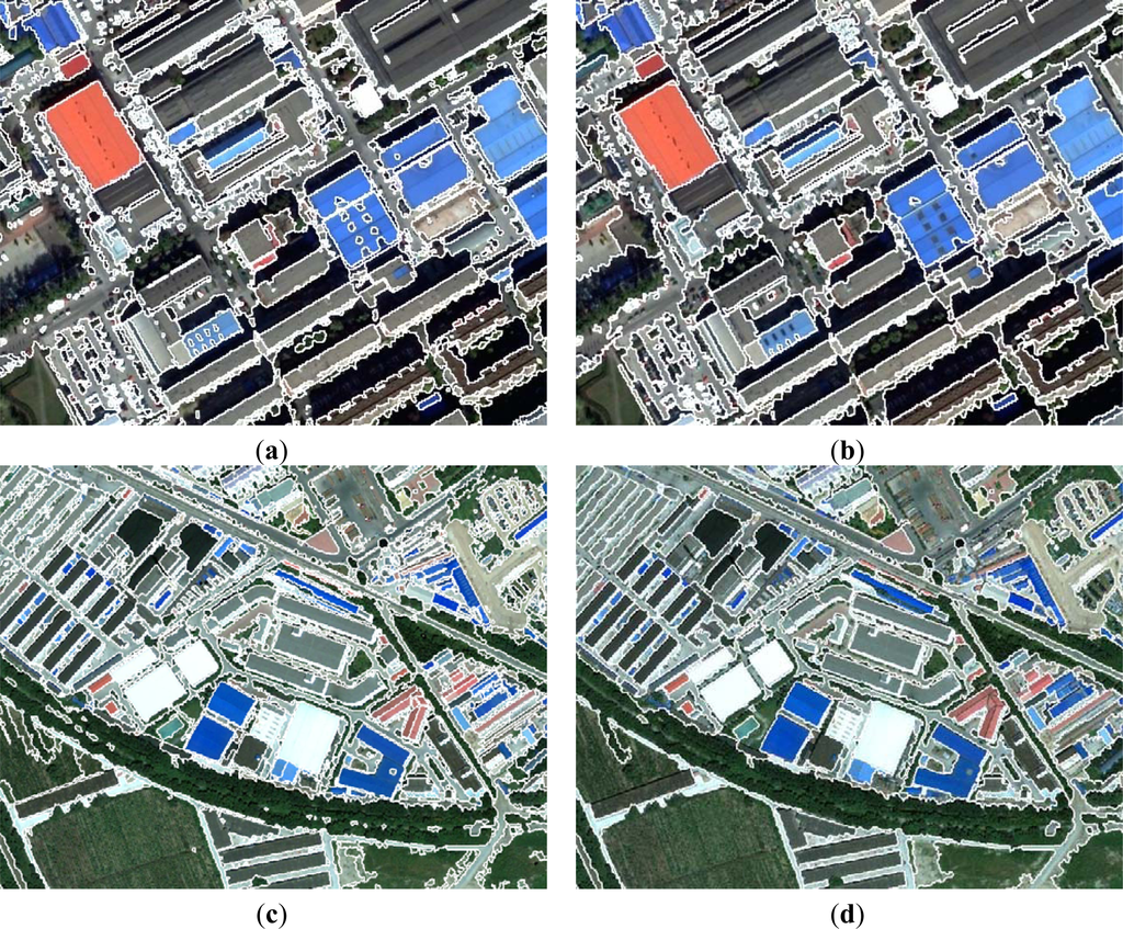 Region merging results with different threshold values. (a,b) Region merging result with Tm = 2 and Tm = 3.5 respectively for GeoEye-1 image in Experiment A; (c,d) Region merging result with Tm = 2.5 and Tm = 3.5 respectively for IKONOS image in Experiment B.