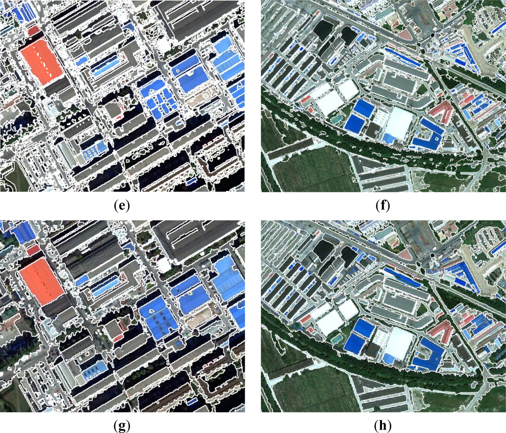 Initial segmentation completed with a too small Ts value will lead to trivial and broken segments, increasing the number of useless merge operations. At the same time, using a large threshold value will lead to an ineffective separation of objects and the generation of lots of jagged edges in the final results. Therefore, we selected 10 classes of ROI of typical ground target: water, grass, asphalt road, cement road, shrubs, close-planted forest, bare land and roof, and then analyzed the consistency for each class. The results of the analysis show that water has the strongest consistency. The range of its standard deviation average of red, green and blue bands is 7–10 in the true color image. Therefore, we used Ts = 10 for the quadtree segmentation threshold value, as shown in Figure 9d and Figure 10d.