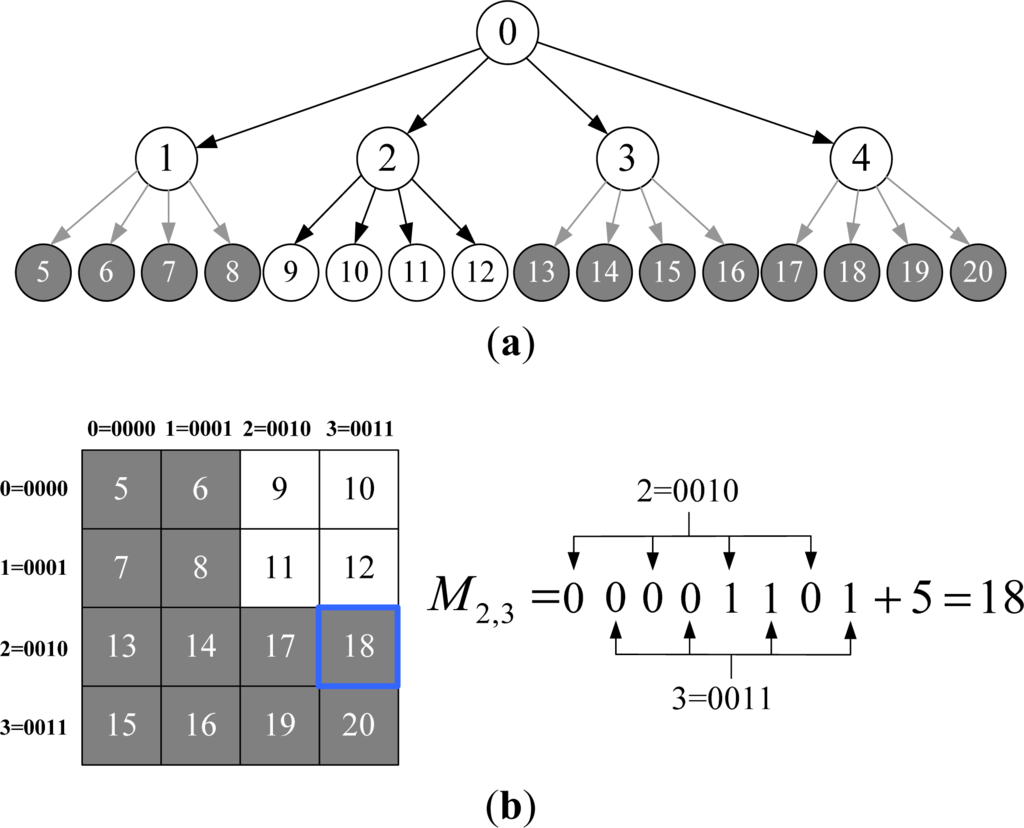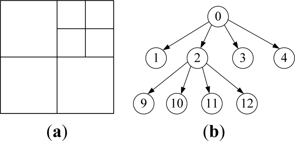 Morton coding assumes that the code of the root node (represents the whole image) is 0. For each of the inner nodes encoding as i(i ≥ 0). Codes of its 4 children are 4i + k (k = 1,2,3,4). Through this coding mechanism, the layer index of node i can be obtained by [log4(3i + 1)] (i ≥ 0) and its parent code can be obtained by [(i – 1)/4] (i > 0). Figure 3 is an example of quadtree segmentation and its Morton coding.