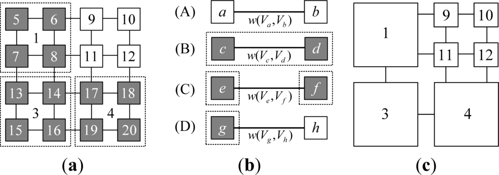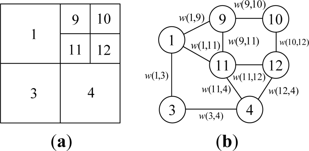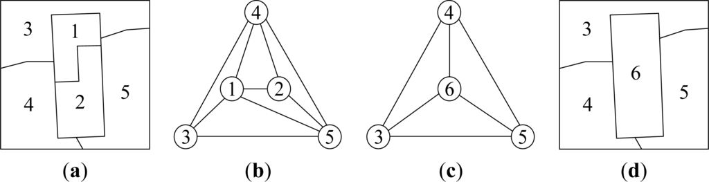where uk is the feature vector of new merged region. Other variables have the same meaning as they do in Equation (8). Suppose the region merging is processed as shown in Figure 8a. There are five regions numbered as 1–5. Regions 1 and 2 are homogeneous regions that can be merged. Figure 8b shows the corresponding RAG. Regions 1 and 2 are merged to form region 6. The feature vector for region 6 can be calculated using Equation (9). The edges can then be reconstructed: remove edge w(1,2) connect vertices 1 and 2; use edges w(6,3), w(6,4) and w(6,5) as new edges update w(1,3), w(1,4) and w(1,5), respectively as shown in Figure 8b; All the edges connect to vertex 2, w(2,4) equivalent to w(1,4), and w(2,5) equivalent to w(1,5), so remove these two edges. The completed RAG and region map are presented in Figure 8b,c.