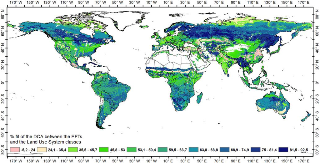 - Correspondence Analysis also indicated that it is not only climate controlling the distribution of Ecosystem Functional Types but that they also correspond to classifications of Land Use Systems, showing that the functional types of global ecosystems might be substantially influenced by anthropogenic activities as well.
