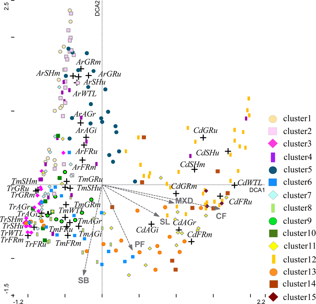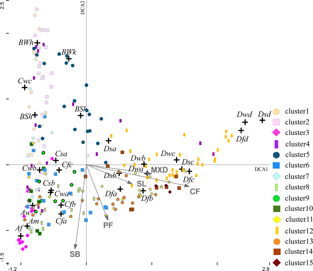 - Hill, M.O.; Gauch, H.G. Detrended correspondence analysis, an improved ordination technique. Vegetatio 1980, 42, 47–58. [Google Scholar]