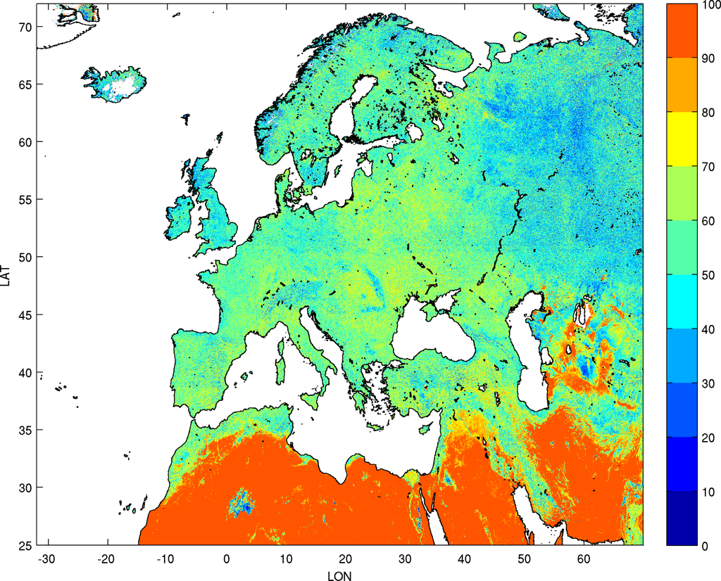 The analysis of the 2002–2004 period, where concurrent observations from SeaWiFS and MERIS are available, reveals a slight discrepancy between FAPAR records. Figure 1 displays the percentage of spatial distribution of the coherency between the SeaWiFS and MERIS FAPAR products, estimated as the percentage of cases when the difference between these products does not exceed the sum of their respective temporal standard deviations. About 4% of the study area over Europe, mostly in the eastern part, is characterized by relatively frequent deviations between the two products. This is probably due to remaining cloud/cloud shadow contamination. The main result is that FAPAR observations from both sensor products agree, within their temporal standard deviation, over more than 60% of the land surfaces, 50% of the time.