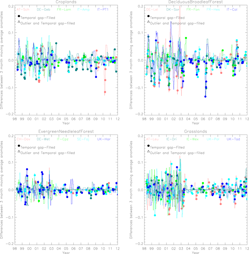Figure 10 focuses on the time evolution of FAPAR signals over local sites with different land cover types. The differences between the three-month moving average anomalies between both datasets generally exhibit temporal variations of up to 0.1 during the first period, i.e., when the SeaWiFs instrument is used, and much reduced after 2003. These differences depend heavily on the site location, and their impacts could be relevant for downstream applications, such as up-scaling in carbon modeling [34]. The dotted (triangle) symbols indicate when at least one value within the three-month period is associated with Flag 2 and 3 (Flag 4 and 5).