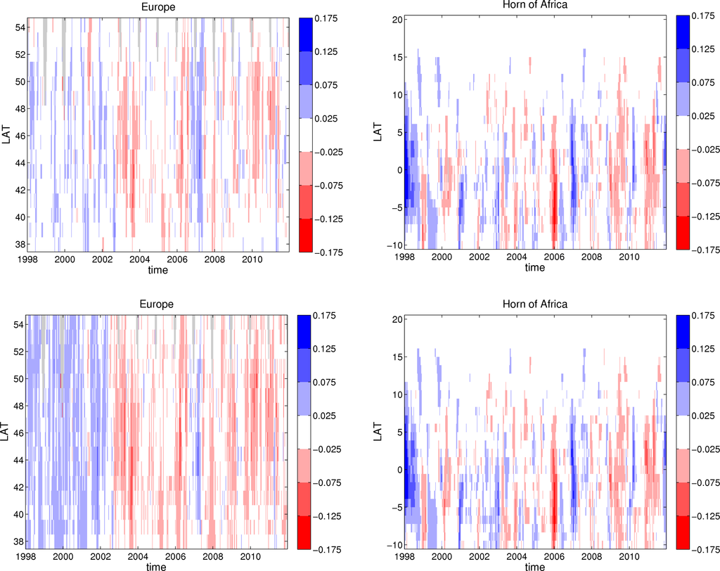 Hovmöller plots of the FAPAR anomalies over Western Europe (left) and over the Horn of Africa (right), employing the harmonized (top) and the original (bottom) products. Positive (negative) anomalies, corresponding to values greater (lower) than the 14-year mean are displayed in bluish (reddish) tones. Periods with no FAPAR data are plotted as grey areas.