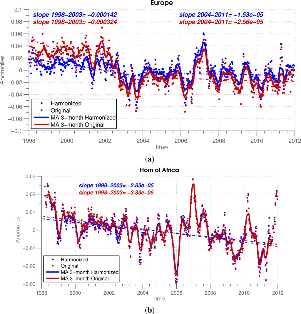 The spatial average of anomalies over Western Europe (top panel) and the Horn of Africa (bottom panel) with original and harmonized data are shown in Figure 12. On these figures, the red and blue lines correspond to the use of the original and harmonized product, respectively. Time series of spatially averaged anomalies are different: those calculated with original records tend to be higher in the first period (1997–2002) and lower in the second period (2002–2011), thus creating an apparent trend. Although the corresponding inter-annual variability can be captured by both datasets, their long-term linear trends fitted with the least squares display large differences. The annual linear trends of the anomalies calculated with the original FAPAR are equal to −0.00019 and −0.00003 per 10-day period for the western part of Europe (1998–2003) and the Horn of Africa (1998–2011), respectively. Conversely, the corresponding trends calculated with the harmonized dataset are equal to −0.00005 and −0.00002 per 10-day period, suggesting that the long-term trends of anomalies were overestimated by the original data. These results indicate that the harmonization processing, by correcting the bias between products from both sensors, has a good ability to minimize the artificial trends.