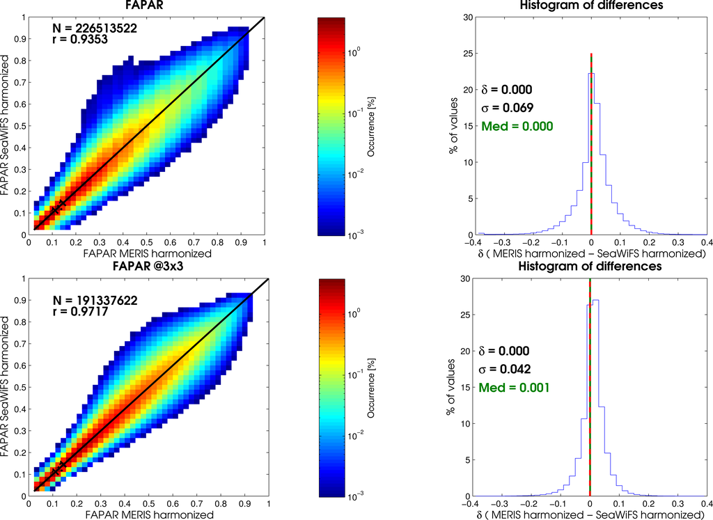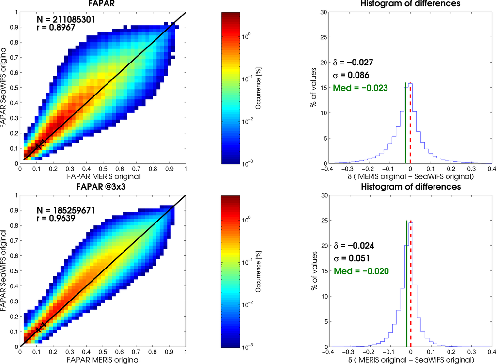 Scatter-plots and histograms of the differences of the FAPAR 10-day product over Europe acquired in 2003 using MERIS and SeaWiFS products over a 1 × 1 pixel (top) and 3 × 3 pixel window (bottom). Reddish (bluish) areas in the plots indicate a higher (lower) density of sample points. The 1:1 line is shown in black.