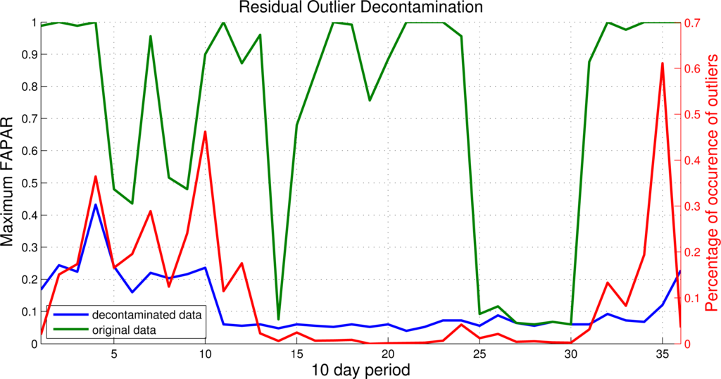 FAPAR daily records, especially over northern Africa, may contain outliers. As the cloud mask in the SeaWiFS processing chain is based only on a threshold algorithm and few acquisitions may be available during each 10-day period, SeaWiFS records may exhibit saturated signals (i.e., close to one) over desert regions. In order to remove these values, a standard mean deviation test is used. The test is performed every year by calculating the mean and the standard deviation of the data and then calling anything that falls more than three standard deviations away from the mean an outlier. This procedure is applied once: the values that are deviating from the natural data variability are rejected and no further iteration is needed. An insight on the need of the residual outlier decontamination is given in Figure 4. Figure 4 displays the time-series of the maximum FAPAR obtained from SeaWiFS for 1998 over a test region located in the Sahara (30°N–35°N, 10°W–10°E) before and after the application of the standard deviation test. Indeed, most of the outliers are found over the desert with SeaWiFS, especially when only one observation occurs (thus making it more difficult to detect by the time-composite procedure). Further, showing the results over a large area, rather than on a single pixel, allows a better representation of the effectiveness of the method (e.g., increasing the occurrence of high FAPAR values). The red line describes the frequency of occurrence of outliers, indicating that the percentage of outliers is always lower than 1%. No significantly saturated signals are observed in the temporal profile of the corrected dataset.