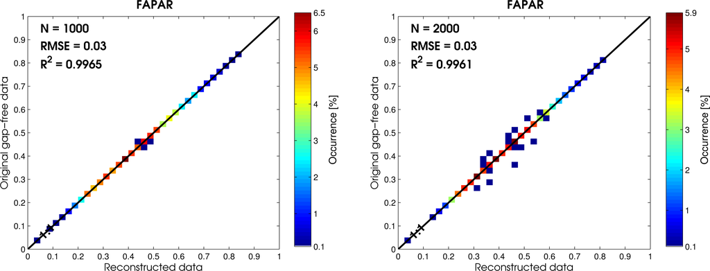 Impact of the gap filling process on the FAPAR dataset over a test region located in the western part of France. Scatterplot of observed and reconstructed FAPAR fields from MERIS during 2006 with one gap (left panel) and with two consecutive gaps (right panel). The underlying idea of this test is to use an almost cloud-free FAPAR time series representing the ‘truth’, to alter them by imposing data gaps randomly and to evaluate the performance of the temporal gap-filling approach described above.