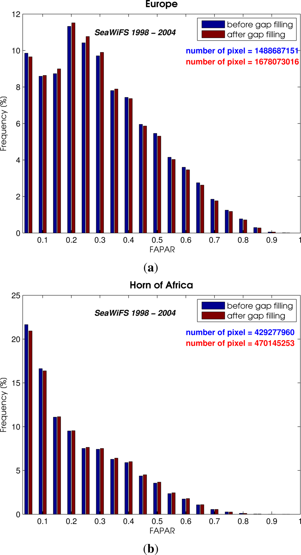 FAPAR distribution from SeaWiFs records (i.e., 1998–2004) before (blue bars) and after (red bars) gap filling over Europe (a) and over the Horn of Africa (b).