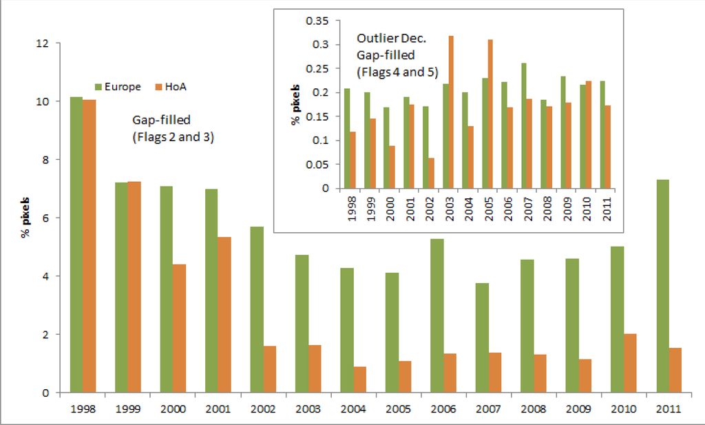 Figure 7 shows the comparison (scatter-plots and histograms of differences) of the FAPAR 10-day product over Europe acquired in 2003 using harmonized products over the 1 × 1 (top panel) and over the 3 × 3 pixel windows (bottom panel). These scatter-plots are complementary to those of Figure 2, allowing, thus, the comparison between the original and the harmonized datasets. As can be logically expected, Figure 7 illustrates the impact on the harmonization procedure on the FAPAR products, showing the improvement in all statistical indicators. Indeed, the figures show that the harmonization process reduces the averaged value of the differences of FAPAR between MERIS and SeaWiFS (with δ = 0.001). A perfect harmonization would collapse all points on the 1:1 line; it can be seen that the harmonization procedure is particularly efficient, in any case, and the bias is reduced. The correlation coefficient, r, goes from 0.897(0.964) to 0.935(0.972) for 1 × 1 (3 × 3) pixel(s). The proposed methodology supplies a per-pixel flag, informing the processing chain. Each flag documents which procedure was performed (see Table 1) and is, thus, useful for the data analysis and the corresponding applications. For example, the occurrence of Flags 2, 3, 4 and 5 over the two study regions are reported as a function of the year in Figure 8. It is worth noting that ‘only gap-filling’ is mainly applied on the SeaWiFS data; however, it never reaches more then 10% (4%) for the Horn of Africa (Europe) region. This is the case whenever a large proportion of global, rather than local area coverage, SeaWiFS data were used (see [21] for details). The removal of the outliers occurs less than 0.5% of the cases. On average, 96.32% (95.04%) pixels over Europe (the Horn of Africa) have been neither gap-filled nor removed.