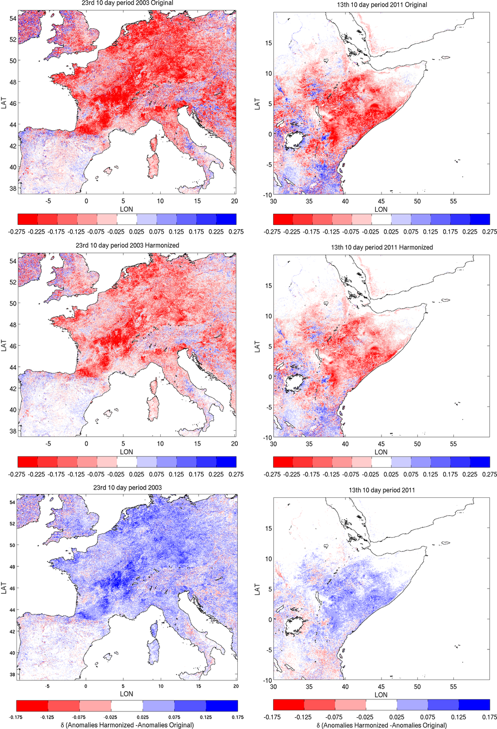 Figure 9 illustrates the impact of the harmonization on intense drought analysis, showing the change of anomalous values (see bottom panels) calculated with the original data (top panels) and with the harmonized one (middle panels) over the western part of Europe on 11–20 August 2003 (left panels), and over the Horn of Africa on 1–10 June 2011 (right panels) [30–33]. Maps of anomalies coming from both datasets show similar spatial patterns, since the negative anomalies (red color) are dominant compared to the positive ones (blue color). However, the impact of the droughts that struck Europe in the summer of 2003 and the Horn of Africa in 2011 shows a lower signature in the harmonized datasets. Figure 9 indicates that 6.15% (25.67%) of the study area over Western Europe (the Horn of Africa) has an opposite sign to the anomalies, whereas the absolute value of the difference among the anomalies is above 0.05 on 31.22% (8.65%) of the study area.