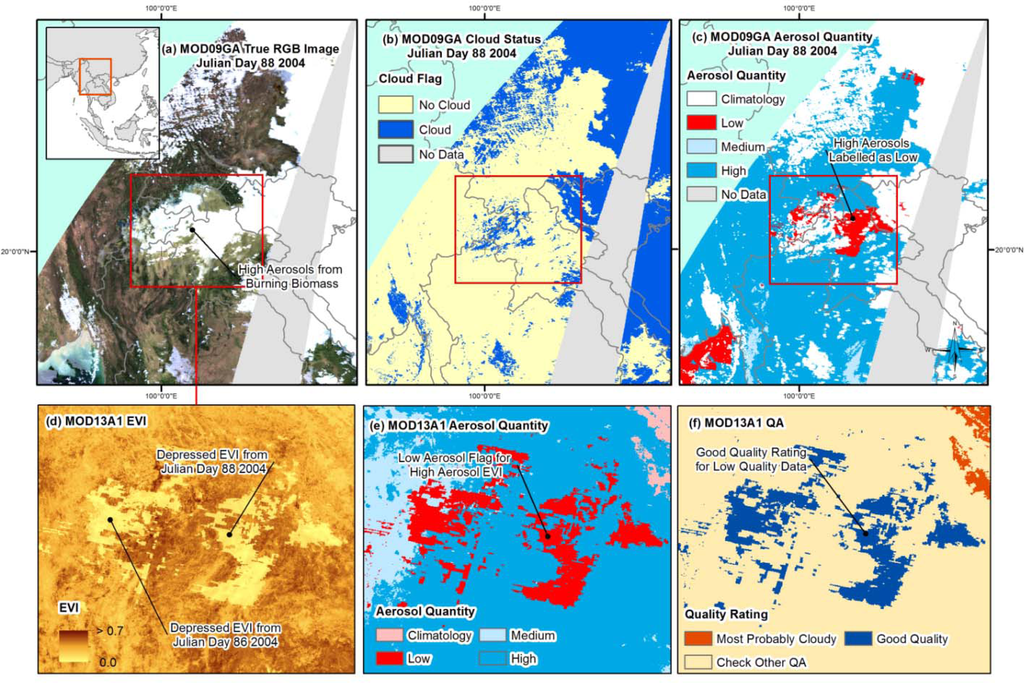 Since this quality information from the daily data (the 1 km State dataset) streams directly into the VI composite processing chain (MOD13 series), the anomaly will inevitably manifest itself in these downstream products. Figure 2a shows a true color image from the four tiles over mainland Southeast Asia (MOD09GA product). Figure 2b,c shows the corresponding Internal Cloud Flag (bit 10) and the aerosol quantity information (bits 6–7) from the 1 km State layer, respectively. The dry season in this region usually runs from November to March/April. This image is captured in the late dry season on 28 March 2004 (Julian day 088). Similar to the Amazon region, this particular time of year is notorious for widespread fire activity, whereby many of the shifting cultivators make final preparations to their plots for the upcoming growing season [53–55]. In this case, an extreme high aerosol area is evident over northern Laos, a landscape overwhelmingly dominated by shifting cultivation. Figure 2c again shows how the problem area where high aerosols are present is labelled as either “Low” aerosols or “Climatology”. A smaller fraction of the area in question is labelled as cloud in Figure 2b. Figure 2d shows EVI values from the 500 m 16-day composite product (MOD13A1) from the indicated subset over northern Laos. For this specific composite image, the compositing algorithm selects the best quality pixel from all MODIS Terra observations from Julian Day 081 to 096. Figure 2e shows the aerosol quantity (bits 6–7 of the VI Quality layer) and Figure 2f shows the corresponding MODLAND QA (bits 0–1 of the VI quality layer) for the same subset. The EVI values are clearly depressed in the areas labelled as “Good Quality” and “Low” aerosols. The “Day of the Year” layer allows the user to track which Julian day each pixel was taken from. The majority of the incorrectly labelled pixels have come from Julian day 088—originating from the extreme high aerosol affected region from the images displayed in Figure 2a–c. Similar anomaly-affected data from other days within the compositing period have also been selected in the composite image.