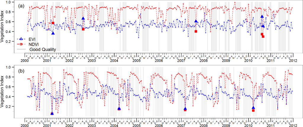 EVI and NDVI time series from the MOD13A1 product for single pixels in (a) the South American Amazon region and (b) mainland Southeast Asia (northern Laos). Grey vertical lines indicate that the observation in the time series is labelled as “good quality” by the MODLAND QA layer (MOD13A1 QA SDS bits 0–1). Both pixels were classified as broadleaf evergreen forest using the International Geosphere Biosphere Programme (IGBP) classification scheme (MCD12Q1 product) and did not experience any land cover change. Highlighted symbols represent VI values that have been affected by the aerosol error, yet have a “good quality” label.