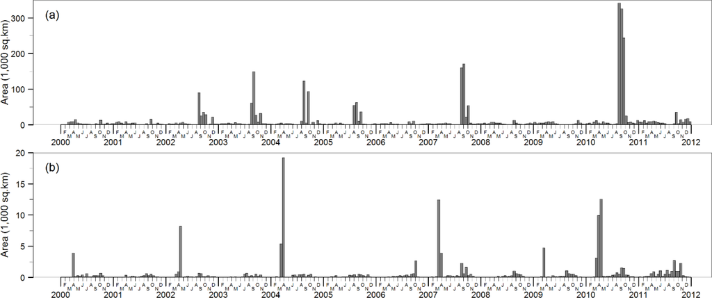 Figure 4a,b shows the estimated stable evergreen forest area affected by the aerosol error for each 16-day composite period for the four tiles over the Amazon region and four tiles over mainland Southeast Asia, respectively, from February 2000 to December 2011. The figures reveal that not only a substantial amount of the composite periods are considerably affected, but that the area affected can be quite large, depending on the season and individual year. The larger spikes are generally confined to the late dry season in each region—August to October in the Amazon region and mid-February to late April in mainland Southeast Asia. However, there are some notable lower magnitude spikes during the August to October periods in mainland Southeast Asia. The smaller bars between the dry seasons are accounted for by the anomaly occurring in high aerosol or cloud remnant spaces often located between areas affected by patchy cloud cover. Although significant areas are affected in both regions, it is obvious that the scale of the problem is more acute in the Amazon region compared to mainland Southeast Asia. In the Amazon study region, an estimated 1,754,700 km2 of stable evergreen forest (62%) has been affected at least once by the error throughout the entire time series. In general, the most badly affected areas (multiple occurrences) were located closer to the forest edge, where most of the clearing and burning occurs. An estimated 861,600 km2 (30%) has been affected at least twice by the error, with some of the hotspot areas affected over five times throughout the time series. 2010 was by far the most badly affected year, with an estimated 869,300 km2 (30%) affected—some areas multiple times. In the mainland Southeast Asia region, it was estimated that 111,135 km2 (24%) of stable evergreen forest are affected at least once by the error. The vast majority of the affected area lies in northern Laos and eastern Myanmar, and these are also the areas that frequently experience multiple occurrences throughout the time series. The worst affected year was in 2004, with a total of 26,170 km2 (5.7%) of evergreen forest suffering from corrupted data in the study region.