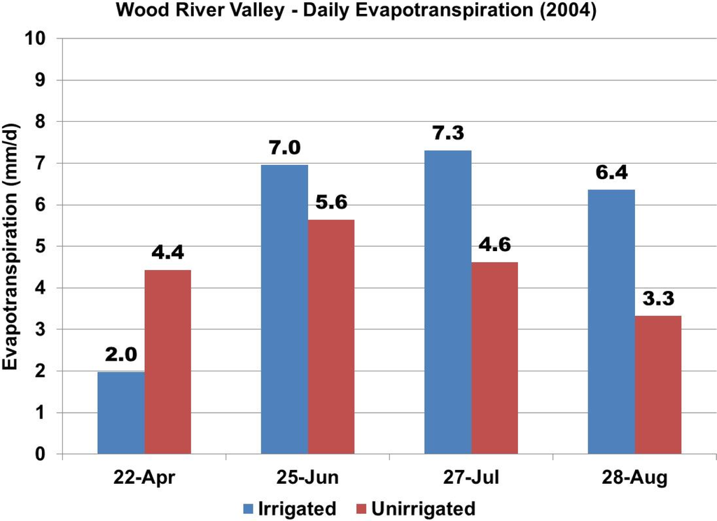 This study was undertaken to test the feasibility of evaluating evapotranspiration from irrigated and unirrigated fields of limited extent and in close proximity, i.e., we were not dealing with a homogeneous distribution of irrigated or unirrigated vegetation cover. The Landsat data were the only thermal band data applicable at a scale that was close to the scale of the irrigated and unirrigated fields. Although point measurements for crop water use for the irrigated and unirrigated conditions were available at the Bowen ratio stations, those data did not allow for the evaluation of the effects of differential water application over the Wood River Valley. This was an essential element to judge the utility of the irrigation forbearance program in terms of leaving water in the Klamath River system.