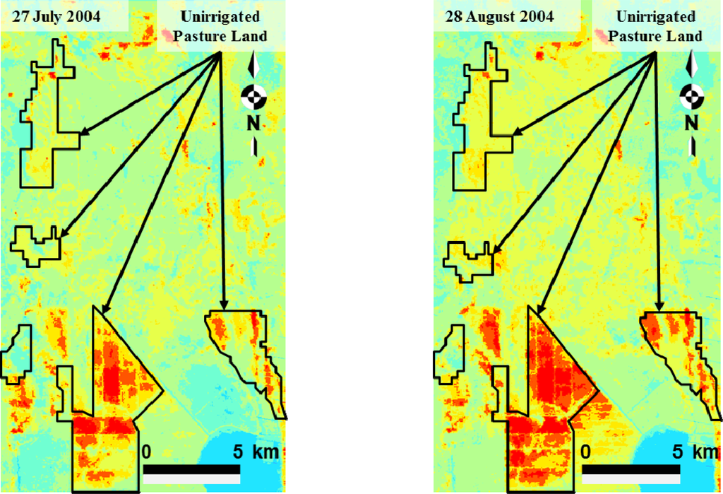 However, discrepancies between on-the-ground observations of pasture conditions and Landsat results suggest some caution when interpreting the results. There are several unirrigated areas that demonstrate higher ET from Landsat than expected, including the unirrigated property in the northwest of the valley (Figure 12). Knowledge of these unirrigated pastures leads the authors to question the levels of ET estimated using Landsat on the July and August images. The grass in these pastures was observed to be near wilting and have very limited growth in mid to late summer. Shallow groundwater levels measured by piezometer on the NW property and at KL03 tracked each other fairly closely and were far below initial water table levels close to the surface at the start of the growing season (Figure 12). Nonetheless, there is significant difference in the LE rates reported from pixels around the northwestern well and KL03 in both the July and August images (Table 3). The reason the Landsat analysis resulted in substantial LE rates from the apparently wilted field is not understood. The two sites have the same soil series and the same mixed pasture vegetation dominated by bluegrasses, ryegrasses, sedge and rush communities. The KL03 property was in its third year of non-irrigation, while 2004 was the first year of non-irrigation for the NW property. This may have led to a difference in management and plant cover and/or species distribution. The NW property was likely minimally grazed out of concern for the amount of forage that would be available, and would have a higher percentage of the wet plant species and a shallower rooting depth. Further study is needed to determine if the discrepancies are due to an actual unexpected difference in ET or differences in conditions, e.g., plant species succession as drought is imposed, that were not accounted for. These results may signify a need to more closely account for what may be considered minor differences in ground conditions when applying the Landsat algorithm.