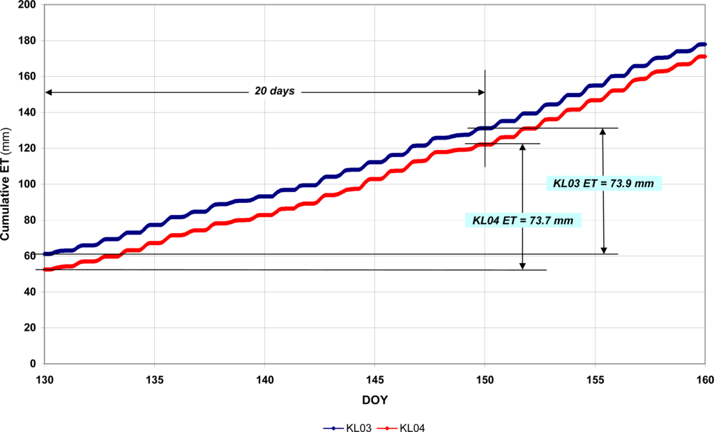 Reference ET was calculated with meteorological data from KL03 and KL04 using the REF-ET software package (Allen []). Reference ET using the FAO 56 Penman-Monteith method was calculated for 20-min time steps over the full season, as this was the recording interval of the Bowen ratio stations. While there were additional ground data available from the Bowen ratio stations that could be input into REF-ET, the decision was made to limit weather data to the inputs used in the 2002 manual (Allen et al. []) to be able to compare to typical results.