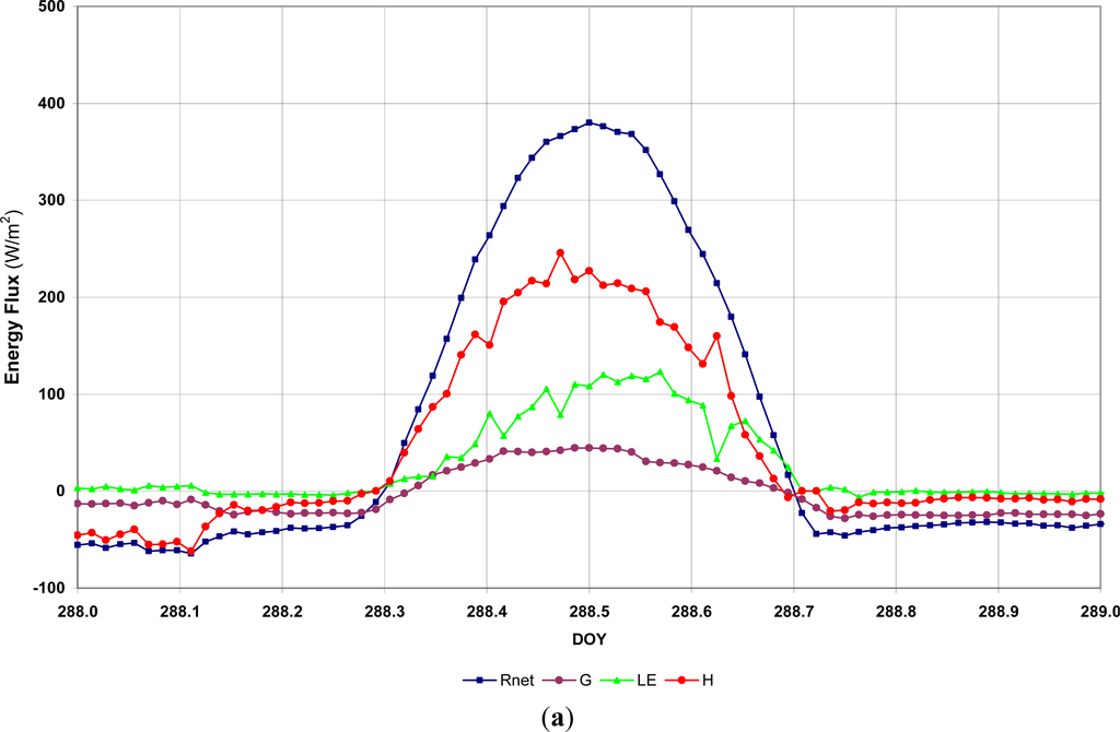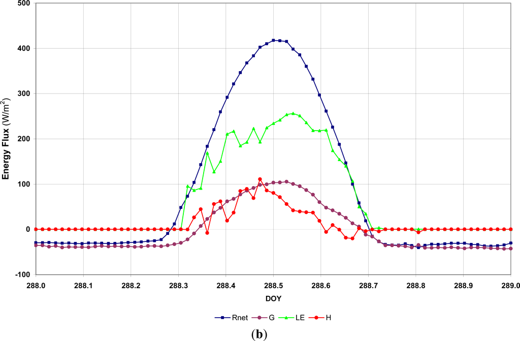 These results are similar in magnitude for instantaneous differences as those reported elsewhere. Kalma et al. [], in comparing some 30 validations of various remote sensing methods applied to evaporative flux measurements, indicated difference on the order of 15 to 30 percent. Morton et al. [] in comparing five Bowen ratio sites and four eddy covariance sites with Landsat derived ET over agricultural sites in Nevada reported daily mean absolute differences on the order of 1 to 27 percent with the mean for all sites on the order of 11 percent. Morton et al. [] indicated that the Bowen ratio and eddy covariance daily ET measurements were assumed by Maurer et al. [] to be accurate to within 12 percent of actual ET based on the literature and direct comparison at one site. Kalma et al. [] indicated a possible error for actual ET measurements in the range of 10 to 15 percent, and Wilson et al. [] indicated a mean energy balance closure error on the order of 20 percent for 22 FLUXNET sites over 50 site-years using eddy covariance instrumentation. A systematic underestimation of the latent and sensible heat fluxes was the source of the closure errors reported out by Wilson et al. [].